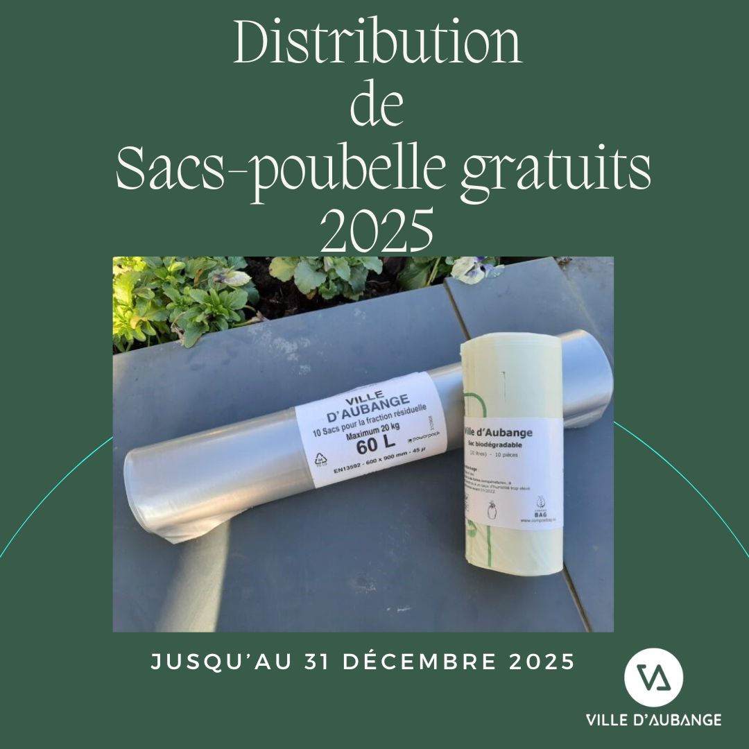 Cette année encore, vous pouvez retirer vos sacs-poubelle gratuits (sacs gris et verts) jusqu'au 31 décembre 2025, au guichet de la direction financière (à droite de l'accueil) selon leurs horaires d'ouverture. Il n'y a qu'une distribution de sacs gratuits par ménage par an.
