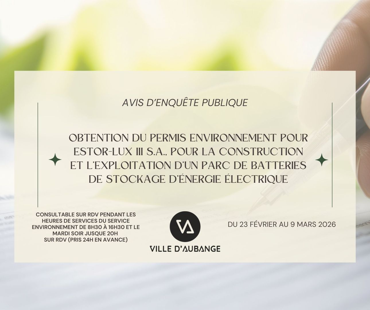 Le Bourgmestre porte à la connaissance de la population qu’une enquête publique est ouverte concernant une demande de permis unique de classe 2 introduite par ESTOR-LUX III S.A., visant la construction et l’exploitation d’un parc de batteries de stockage d’énergie électrique d’une capacité de 375 MW (puissance) et de 900 MWh (capacité de stockage).