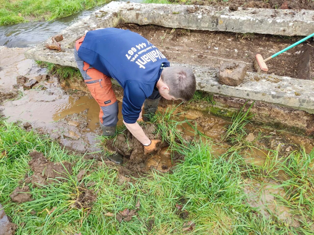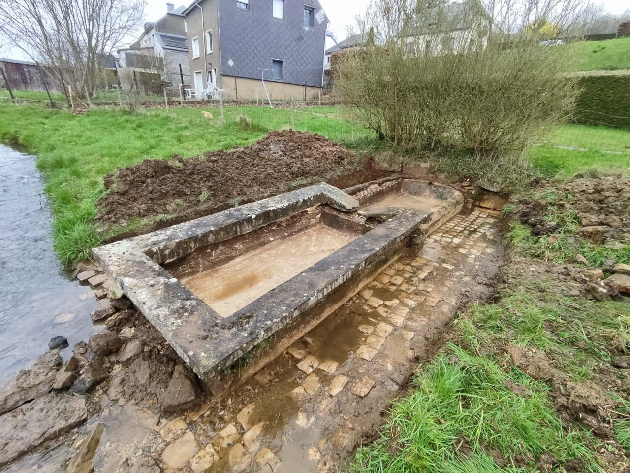Cette intervention avait pour objectif principal de retirer les importantes accumulations de terre présentes dans les deux bacs du lavoir ainsi que sur les pavés environnants. À certains endroits, plus de 40 centimètres de sédiments ont été extraits, permettant de redonner lisibilité et fonctionnalité à cet élément du patrimoine local.