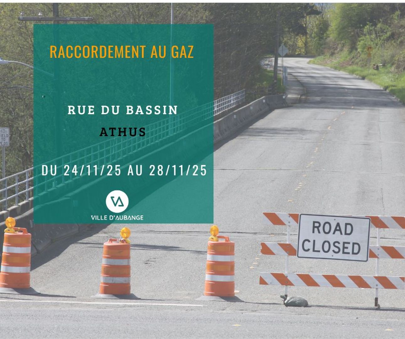 La société EIFFAGE ENERGIES procède à un raccordement au gaz pour ORES, sis rue du Bassin n° 8A à ATHUS, entre le 24/11/2025 et le 28/11/2025.