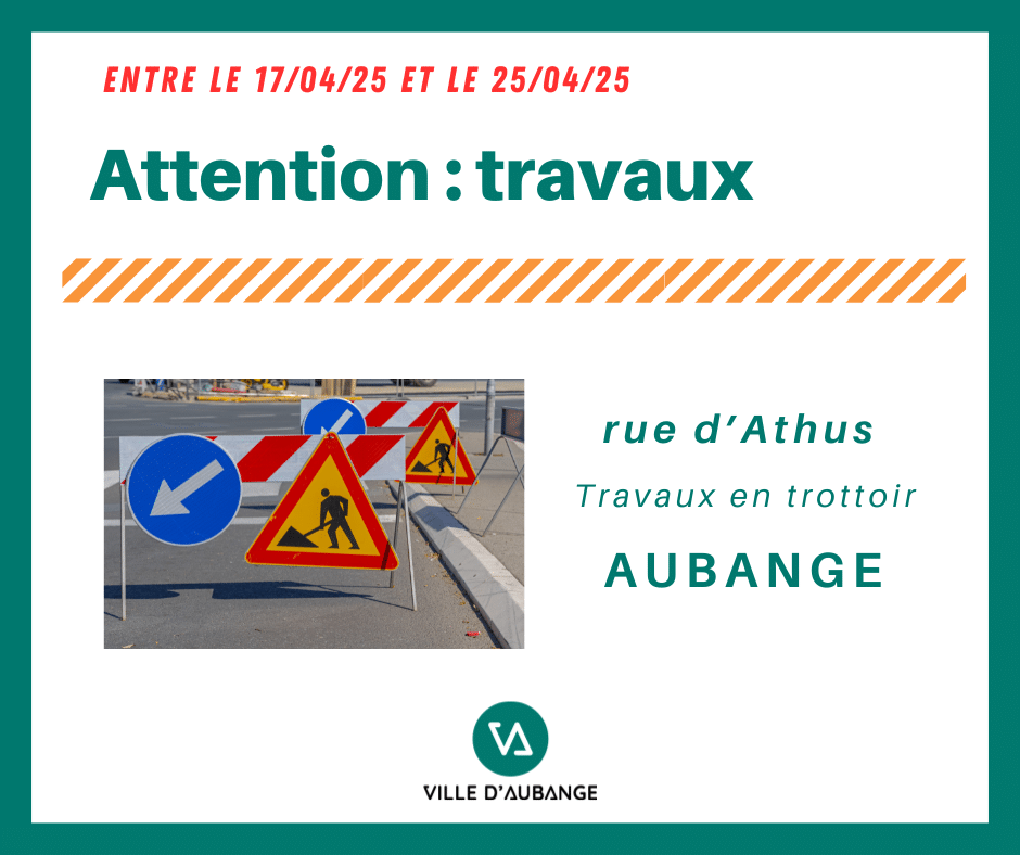 En raison des travaux précités, lors de la première phase, la circulation des véhicules à moteur sera interdite sur la bande de droite de la rue d’Athus à 6790 AUBANGE, depuis le bas de la rue jusqu’au pont surplombant l’autoroute, en direction de ATHUS, le 17/04/25, pour une durée maximum de 4 h.